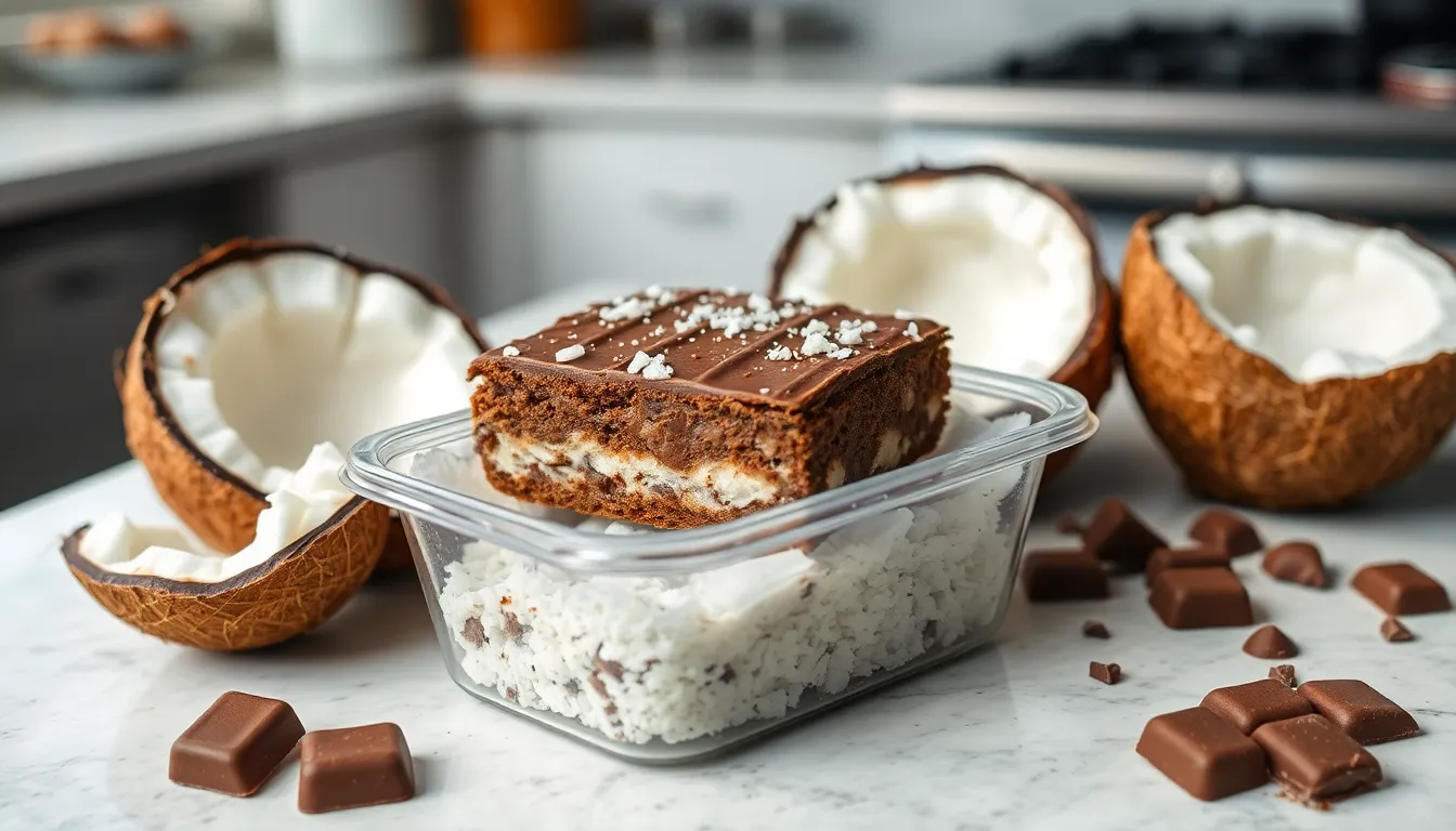 Our freezer method allows preparation up to one month in advance. After completing all layers and achieving room temperature cooling we wrap the entire uncut slice tightly in plastic wrap followed by aluminum foil. This double wrapping prevents freezer burn and maintains the chocolate coconut balance we worked to achieve.