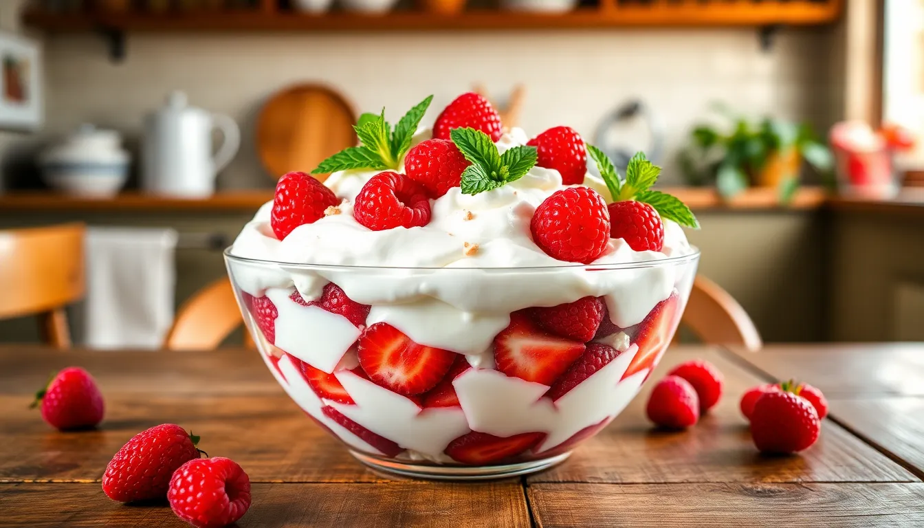 You’ll need minimal kitchen equipment: a mixing bowl, electric whisk (or hand whisk), sharp knife for chopping berries, and serving bowls or glasses. For best results, chill your mixing bowl and whisk before whipping cream. This simple equipment list makes the dessert accessible for both beginners and experienced bakers.