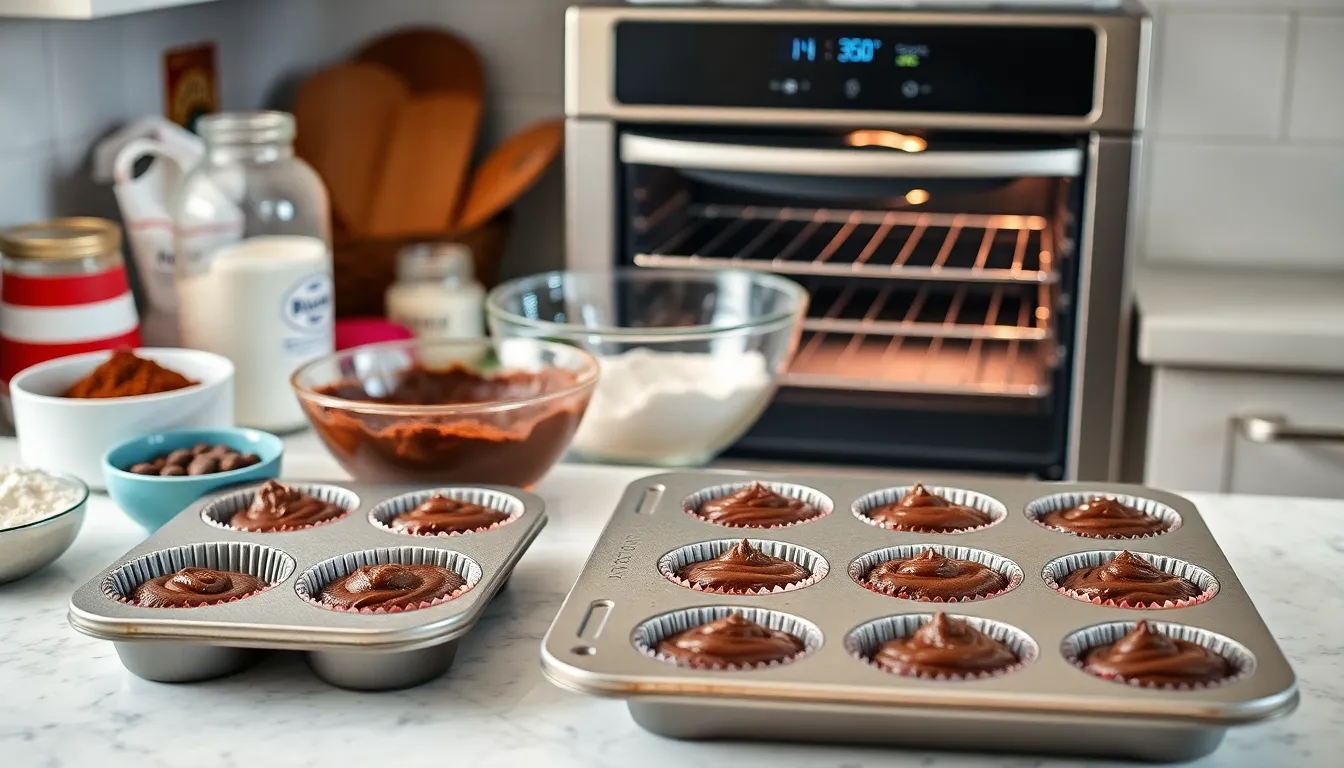 We begin by preheating our oven to 350°F (180°C) to ensure even heat distribution throughout the baking process. Line 6 muffin cups with paper liners or generously grease each cup with butter or cooking spray to prevent sticking. Position the muffin pan in the center of our oven rack for optimal air circulation around each cupcake.
