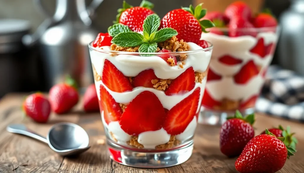 With endless variation possibilities from chocolate versions to vegan alternatives there’s a perfect parfait for every palate and dietary need. The layered presentation never fails to impress while the balanced flavors of sweet strawberries creamy textures and crunchy granola create a memorable eating experience that’ll have everyone asking for the recipe.